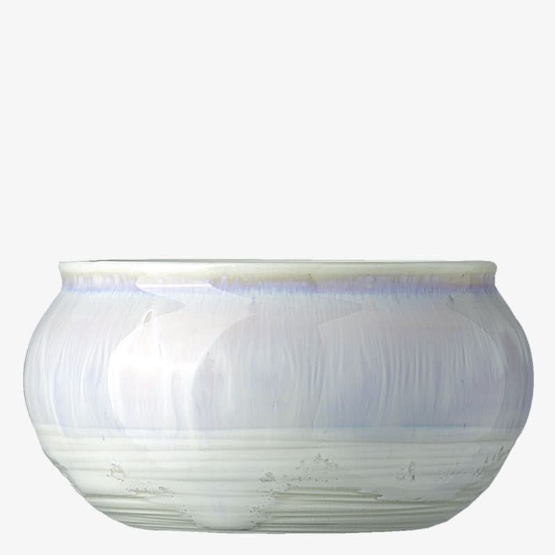 These white porcelain bowls take 8-10 weeks from the wheel to bisque firing to finish. A smooth glazed interior complements the fluxed lavender glass glazed exterior.