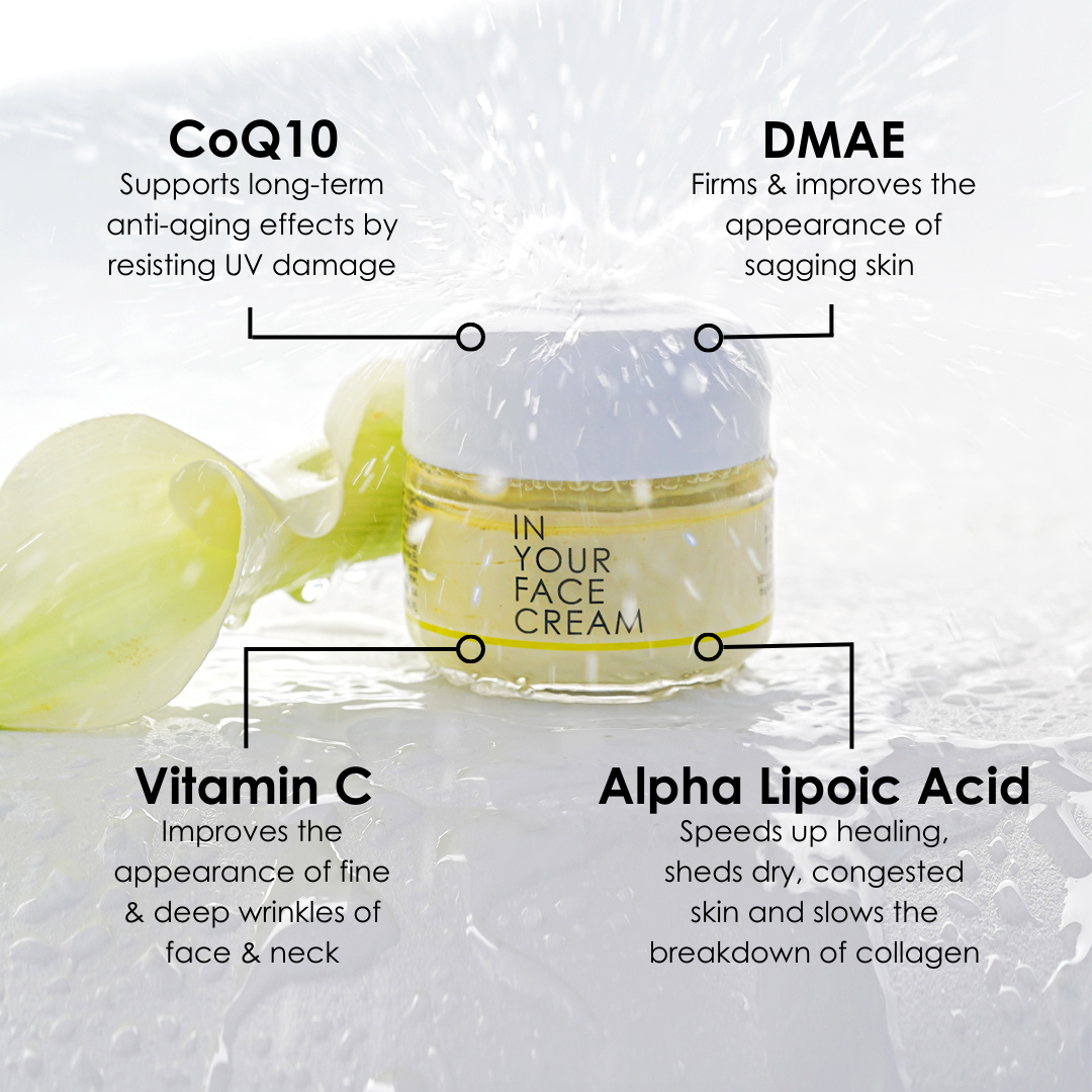 - CoQ10 boosts skin’s natural healing properties to fight off free radicals and keep cells active.