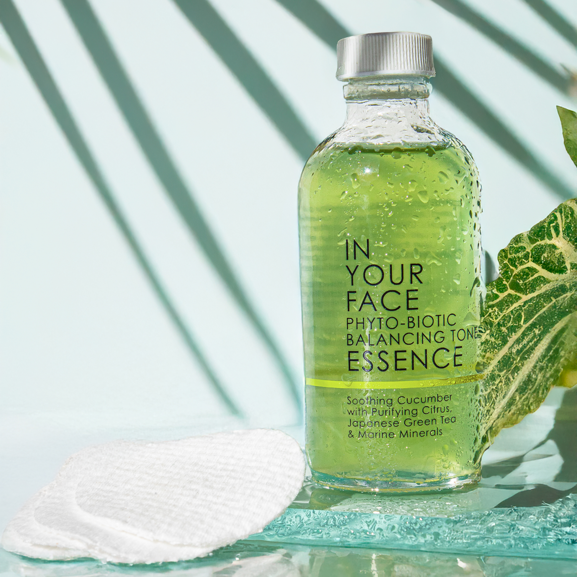 Dampen a cotton pad with our PHYTO-BIOTIC BALANCING TONER ESSENCE and sweep all over face and neck.